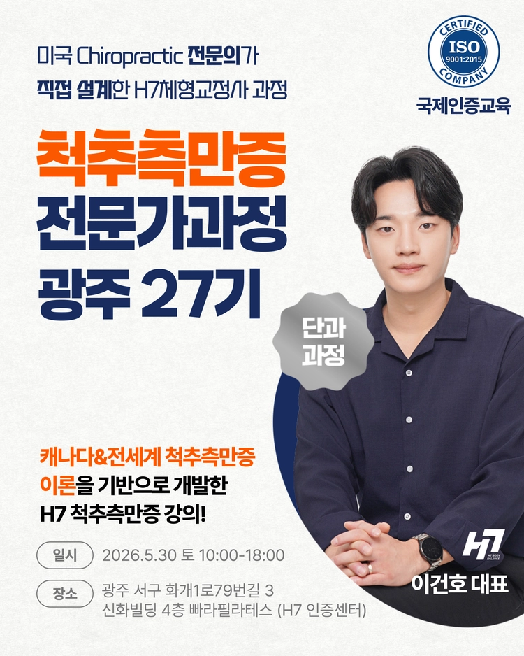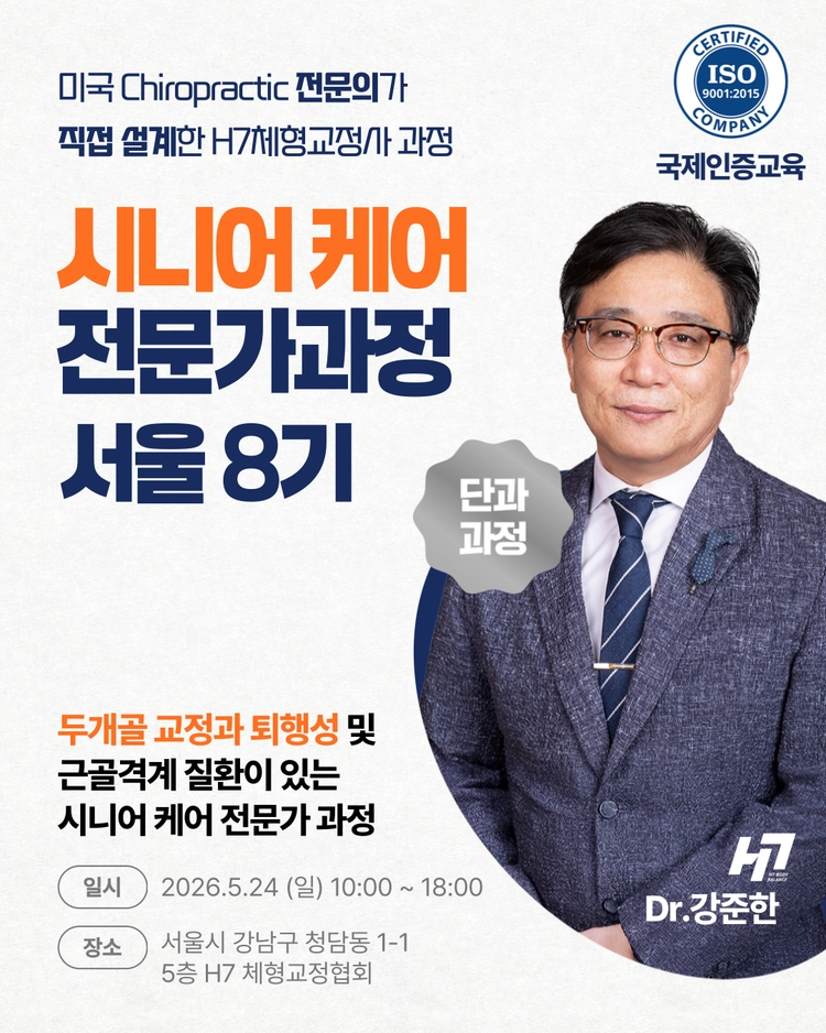 H7 체형교정협회는 미국 카이로프랙틱 전문의와 통합 의학 박사 Ph.D. 강사가 직접 교육을 진행하는 교육 기관입니다.